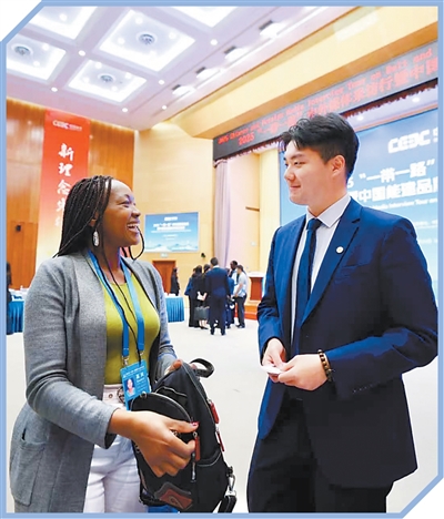 中外媒体嘉宾到中国能建总部调研参观,外媒记者与中方工作人员交流。 |